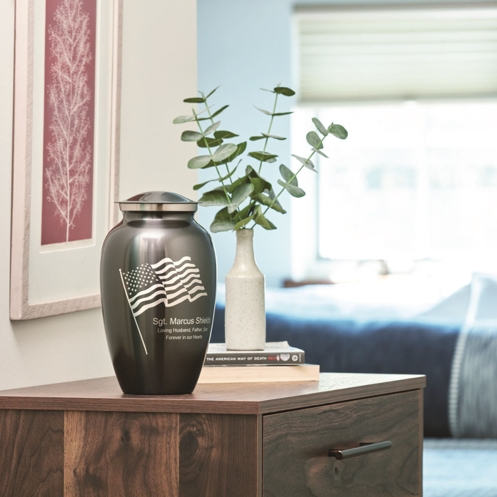 The Classic Flag brings the Classic urn shape in a slate color with a waving American Flag. This urn is perfect for those who want a beautiful memorial with countless personalization options.