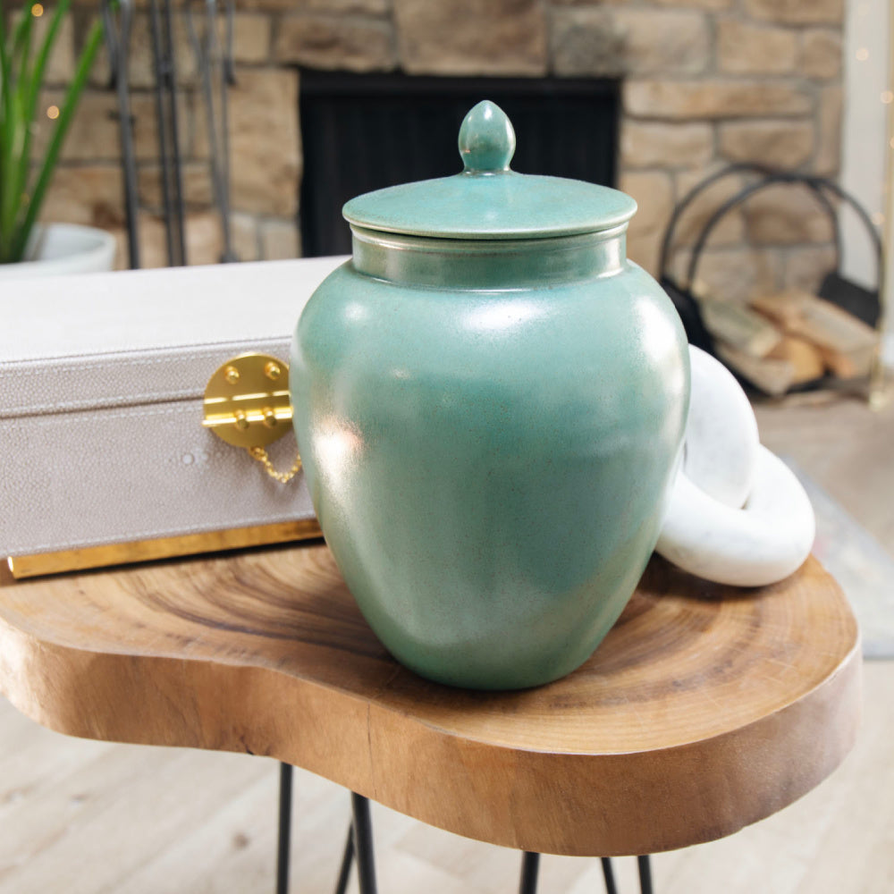 The Edgewood Series celebrates this elemental harmony with its traditional silhouette and richly artistic glazes. Whether you choose the alluring Malachite, the serene Clear Cascade finish on Oyster Shell or Rain Cloud, or the deep, shimmering Copper Aventurine, each urn in this series becomes a radiant tribute to life, love, and memory. A true reflection of a story well lived—and forever remembered.
